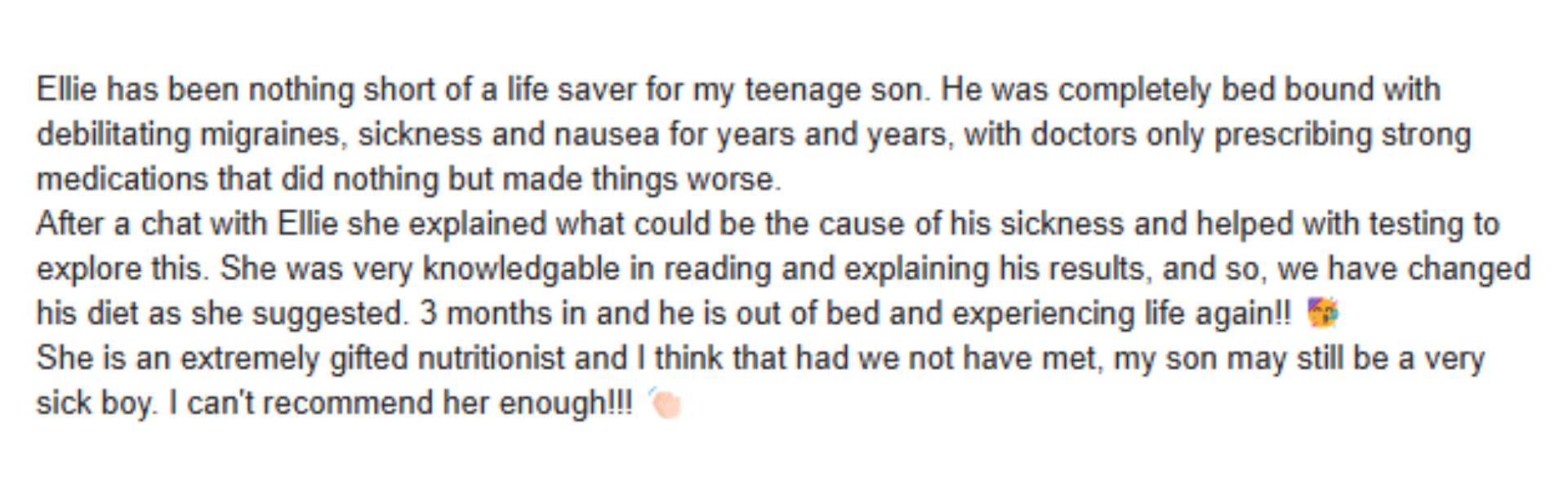 See the example below - a review left by a client whose son had been bed-ridden with migraines and sickness. We applied my approach and he’s shown massive improvements in health and quality of life.